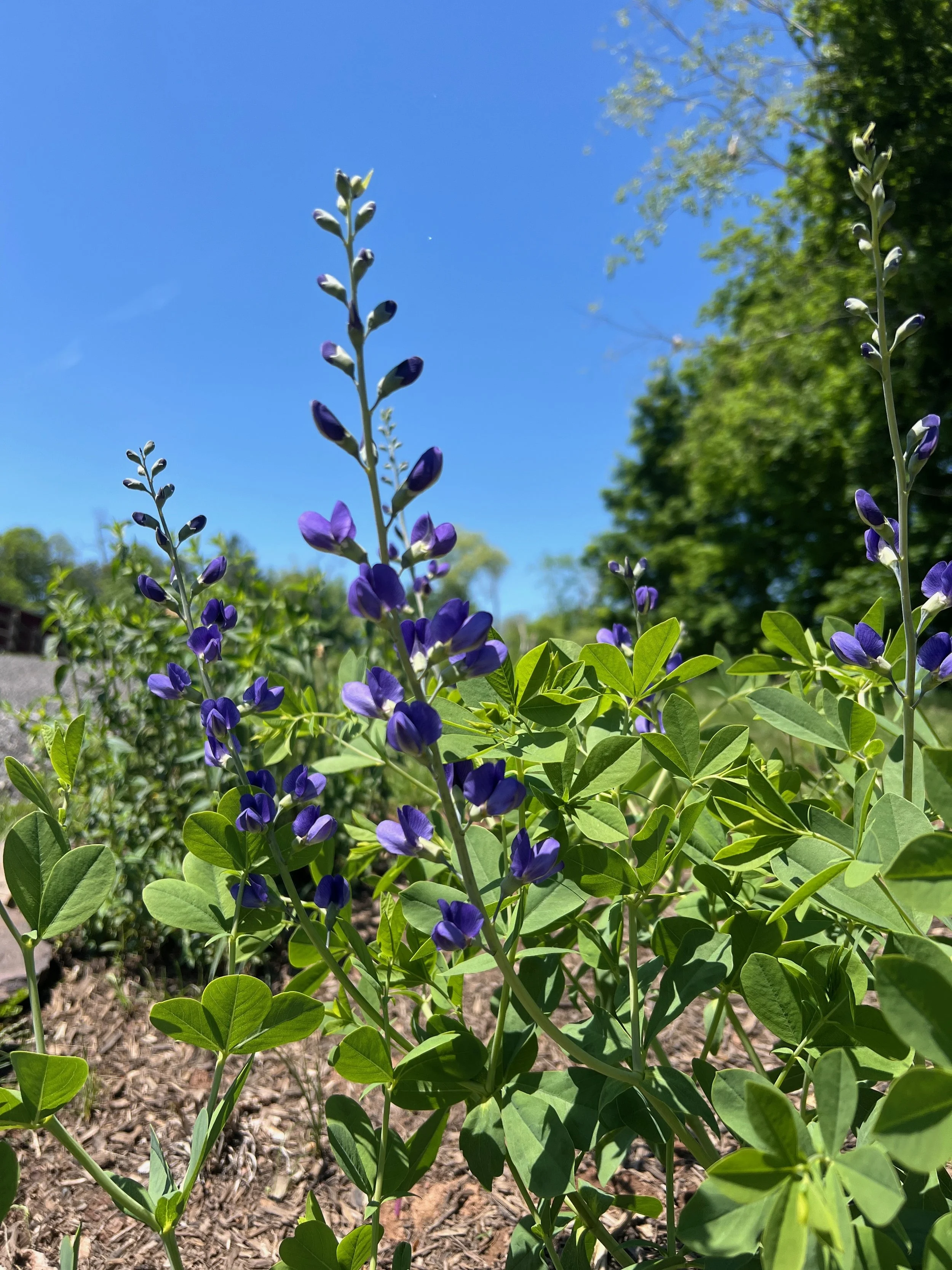 Baptisia is a native plant that produces gorgeous flowers in early May. They come in many colors: blue, purple, yellow, pink. The blue, pictured here, is the true native variety. The others are cultivars, or plants that have descended from native varieties, but have been altered by human breeding.